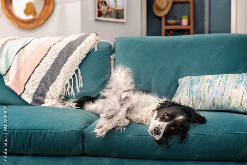 Naklejka na ściany i meble - adorable springer spaniel lying down on turquoise sofa with home decor in the background - beautiful sleepy black and white dog in studio with leg up spread out on couch.