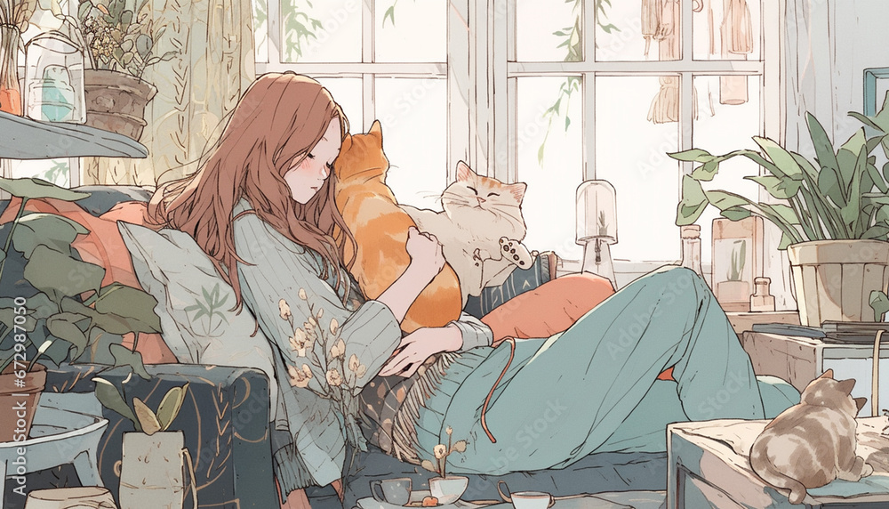 Naklejka na ściany i meble - 家で猫とリラックスする女性のイラスト.