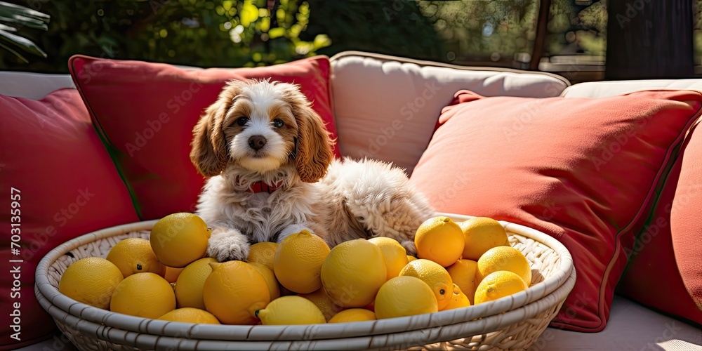 Naklejka na ściany i meble - Cute Dog Lounging in a Basket of Lemons - Experience a Zesty Slice of Life with Your Pet.