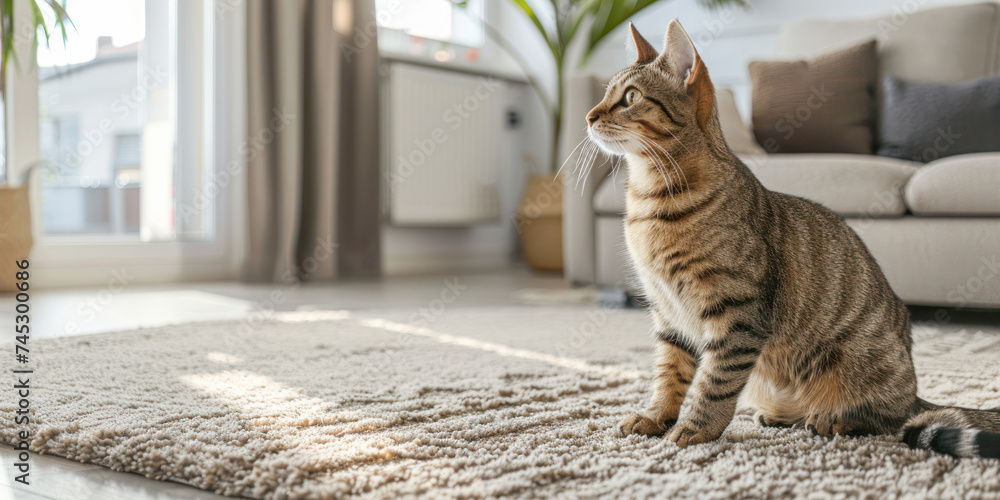 Naklejka na ściany i meble - Cute cat indoors sitting on a carpet on blur living room background..