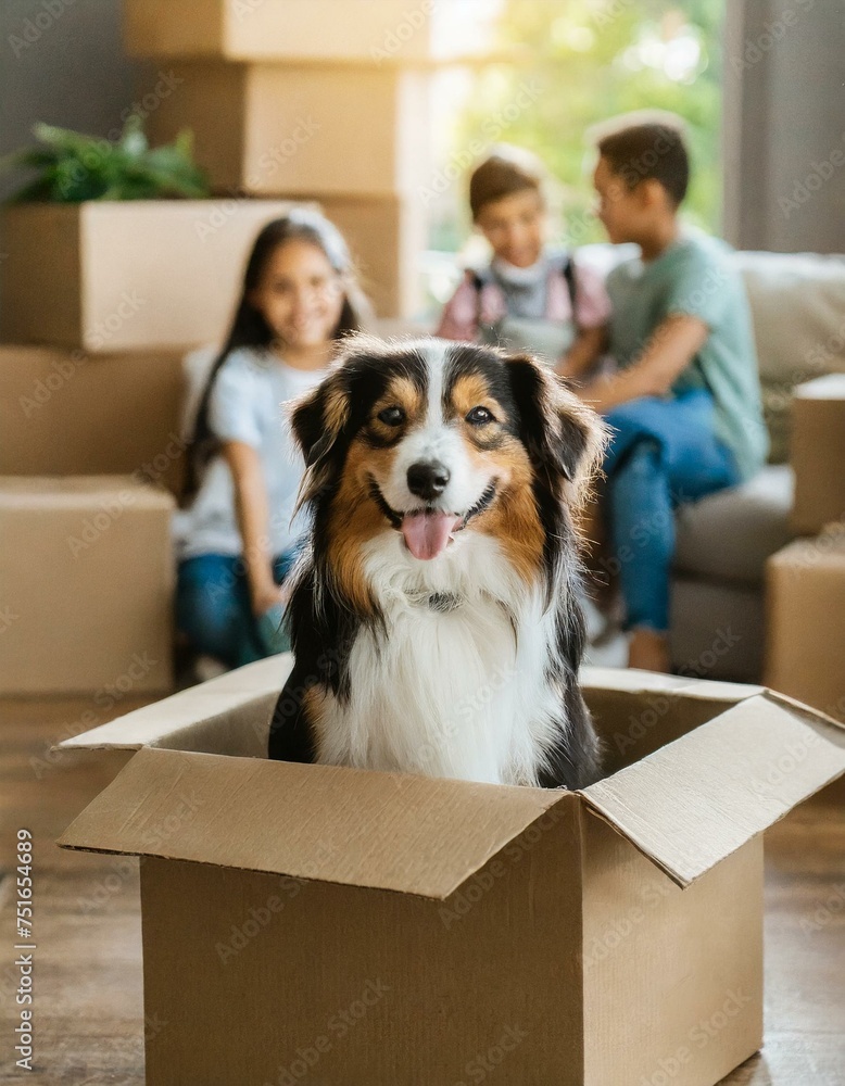 Naklejka na ściany i meble - Family with kids and pets moving to new home. Cute dog sitting in cardboard box. Moving to new home, packing and unpacking boxes, relocation, renovation, removals and delivery service concept.
