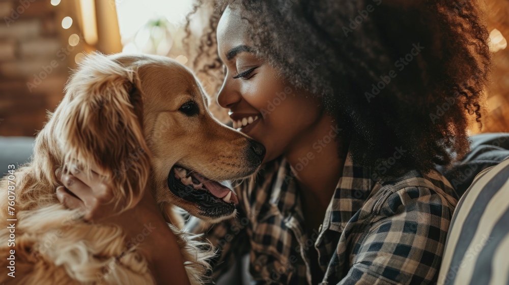 Naklejka na ściany i meble - happy people at home with favorite pet , love and friendship of human and animal pragma.