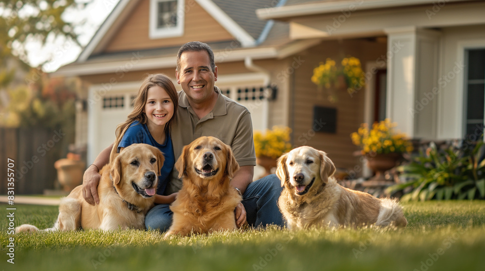 Naklejka na ściany i meble - Happy Family with Dogs Posing in Front of House.