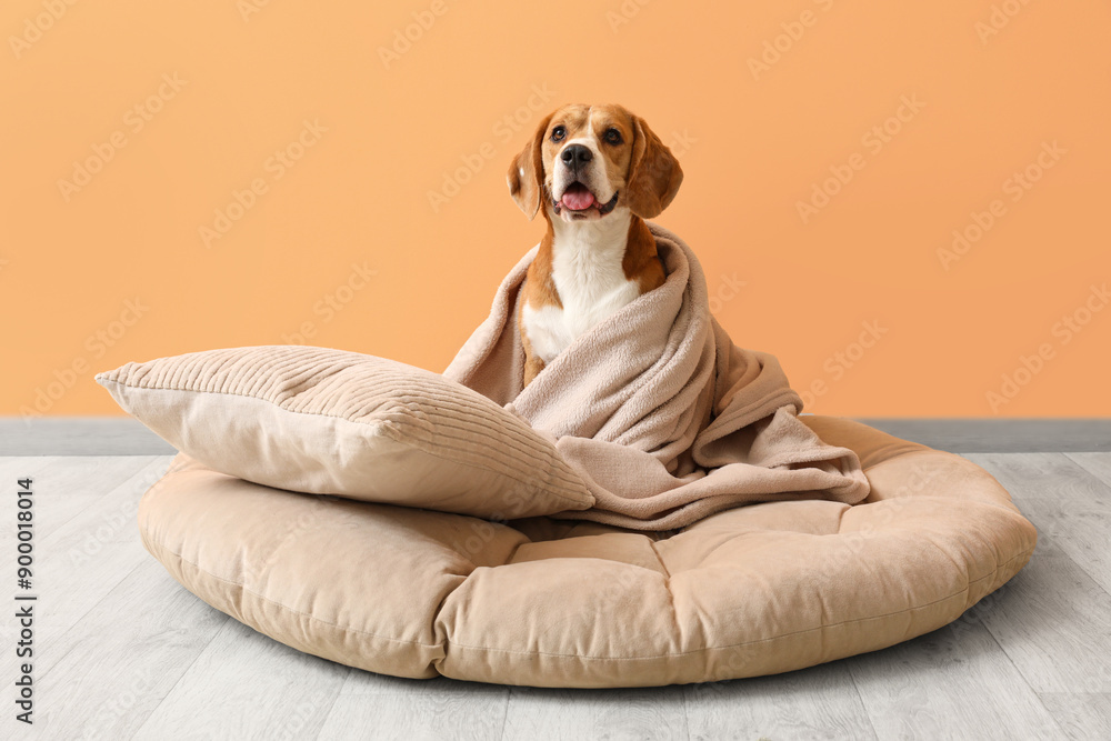Naklejka na ściany i meble - Cute Beagle dog with plaid and soft pillow sitting in pet bed near orange wall.