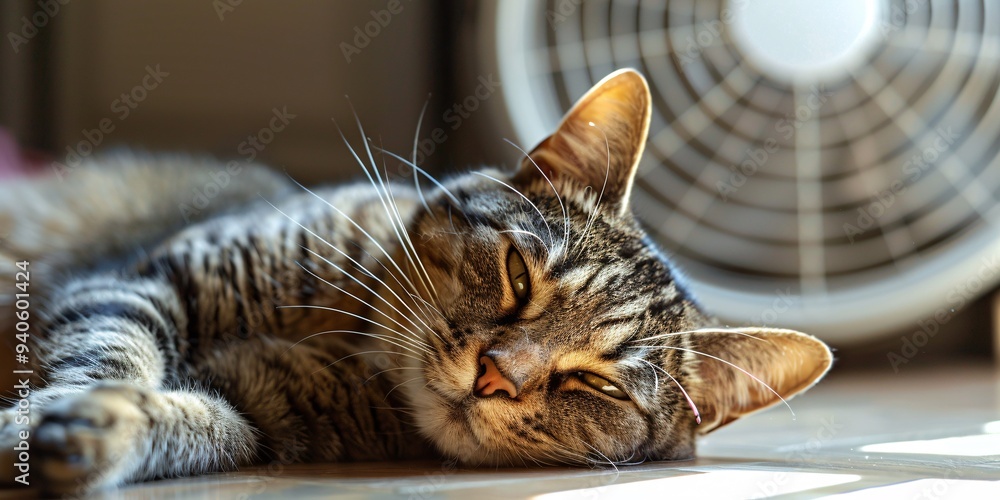 Naklejka na ściany i meble - Feline resting in front of a pale air cooler..