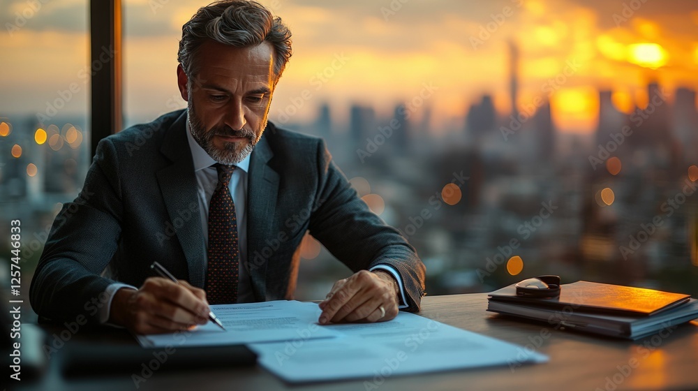 Naklejka na ściany i meble - Businessman signing documents sunset city view.