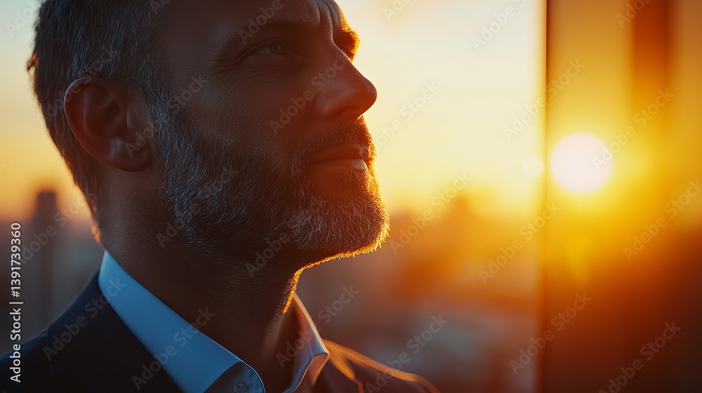 Naklejka na ściany i meble - Man in suit looking at the sunset from a high building with city view in the background at golden hour.