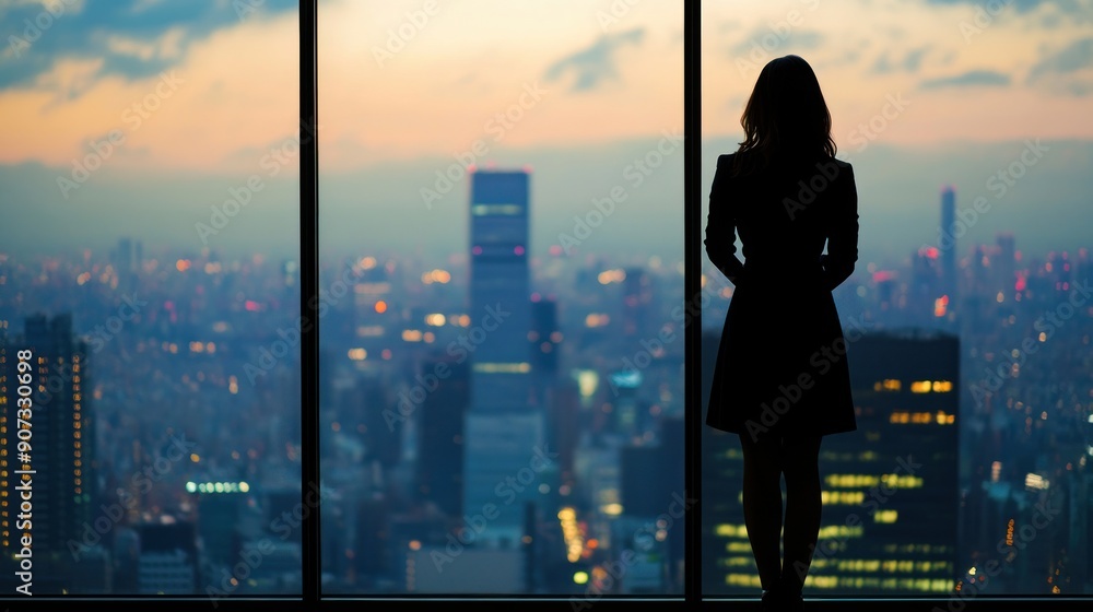 Naklejka na ściany i meble - Silhouette of a Woman Looking Out of Window at Cityscape.