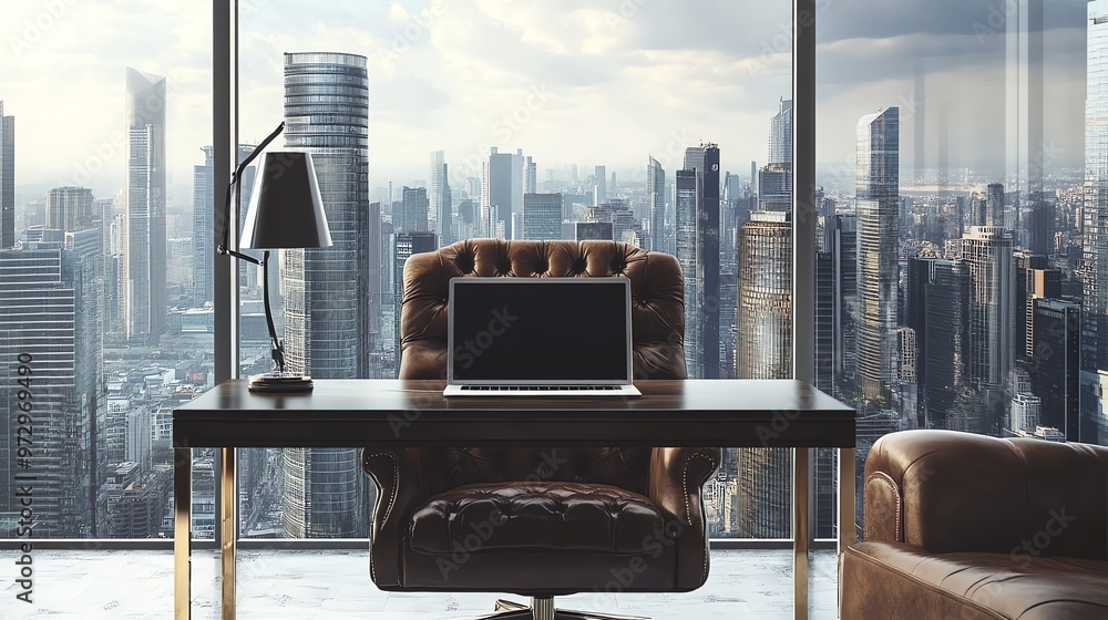 Naklejka na ściany i meble - A modern office with a view of a city skyline at dusk..