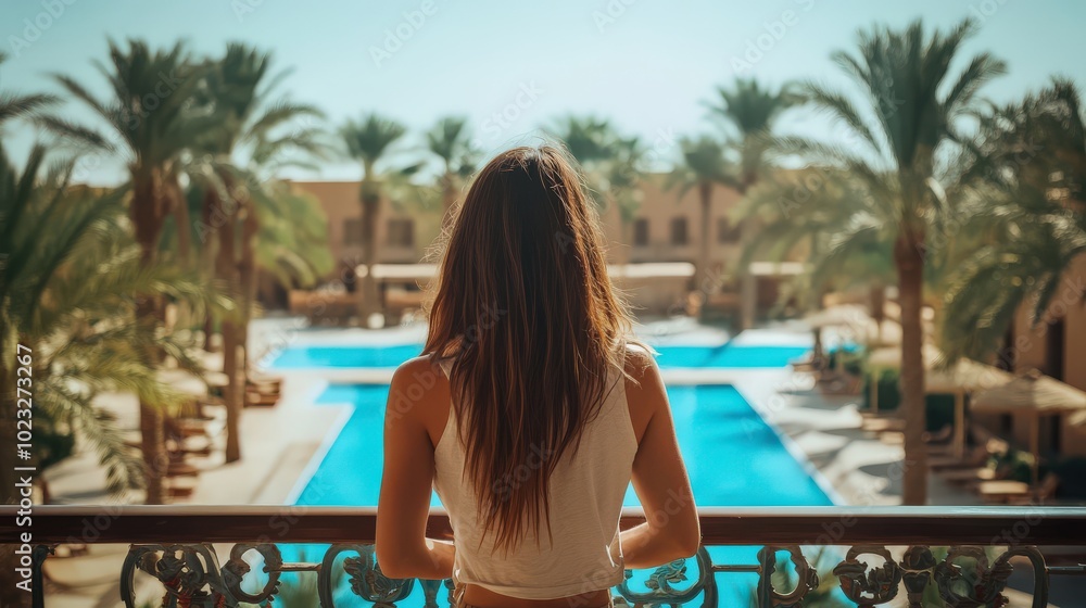 Naklejka na ściany i meble - Hotel Balcony with Young Woman Enjoying Pool View in Tropical Egypt Resort.