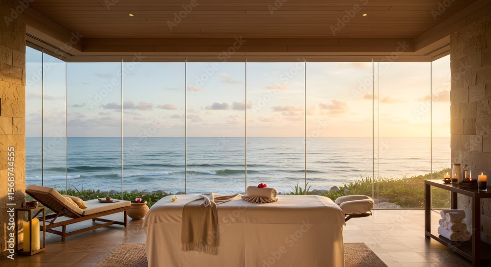 Naklejka na ściany i meble - Private spa interior of a luxury resort with ocean view.