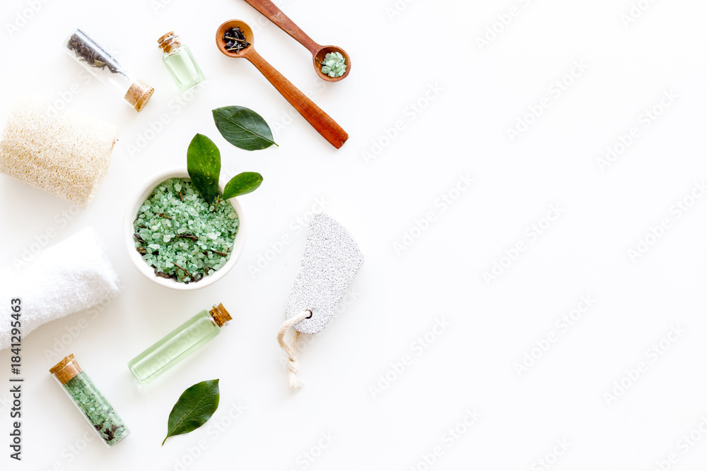 Naklejka na ściany i meble - Spa pedicure accessories and organic cosmetics products - tea tree essential oil and sea salt near green leaves top view.