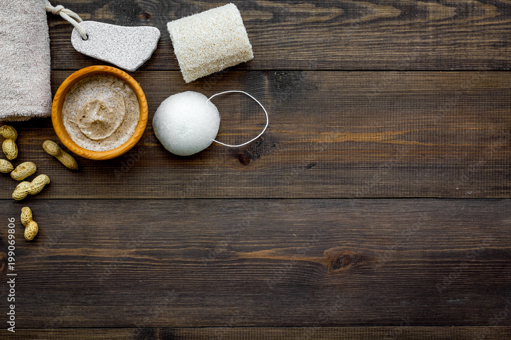 Naklejka na ściany i meble - Treatment set with natural peanut scrub to take bath on wooden background top view mock-up.