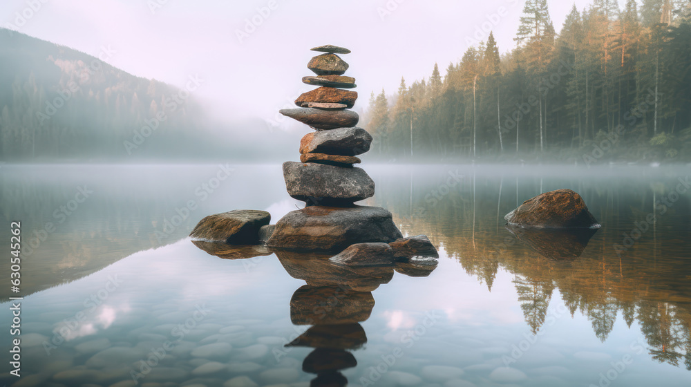 Naklejka na ściany i meble - Many stones balanced and standing in front of a body of water..