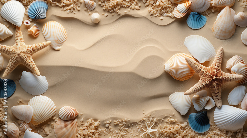 Naklejka na ściany i meble - Seabed with different seashells and sea stars, top view.