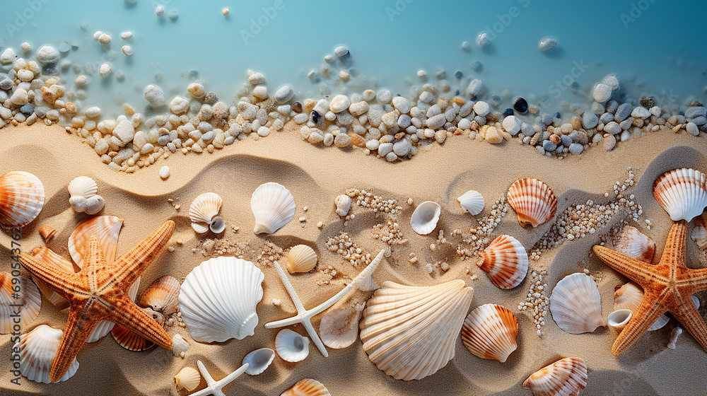 Naklejka na ściany i meble - Seabed with different seashells and sea stars, top view.