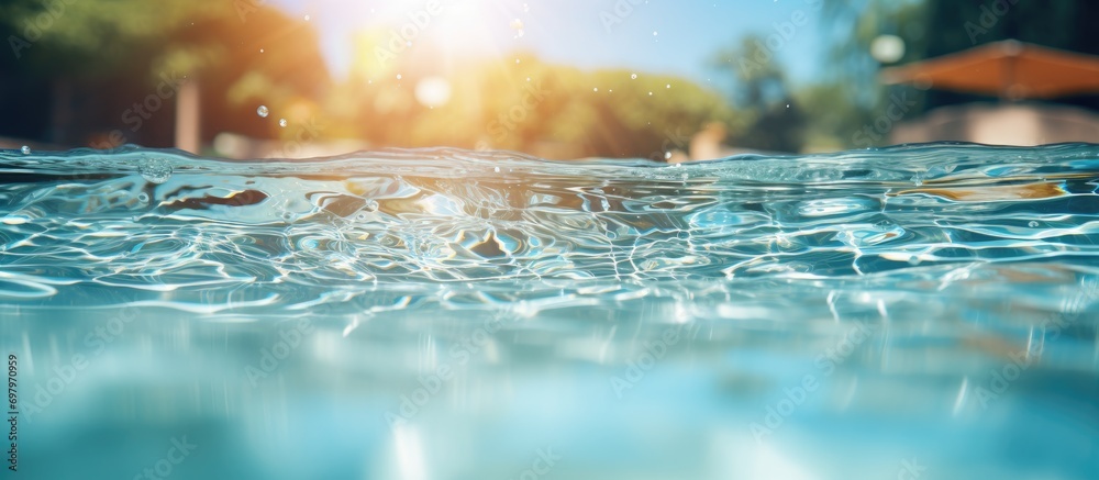 Naklejka na ściany i meble - Blurred focus of bright reflections in the pool on a hot summer day..