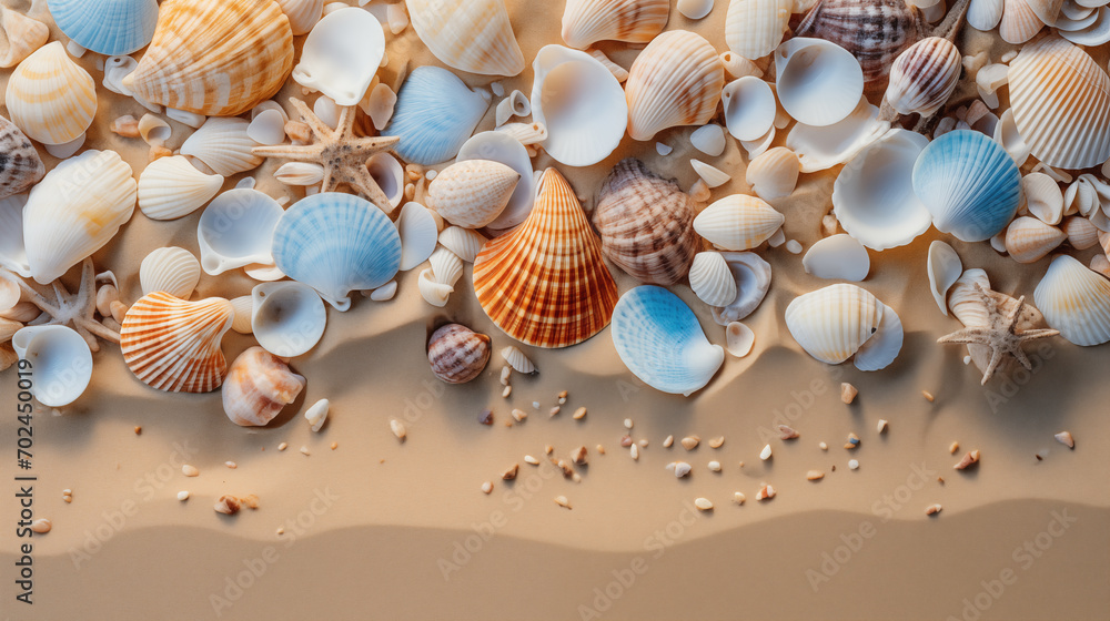 Naklejka na ściany i meble - Seabed with different seashells and sea stars, top view.