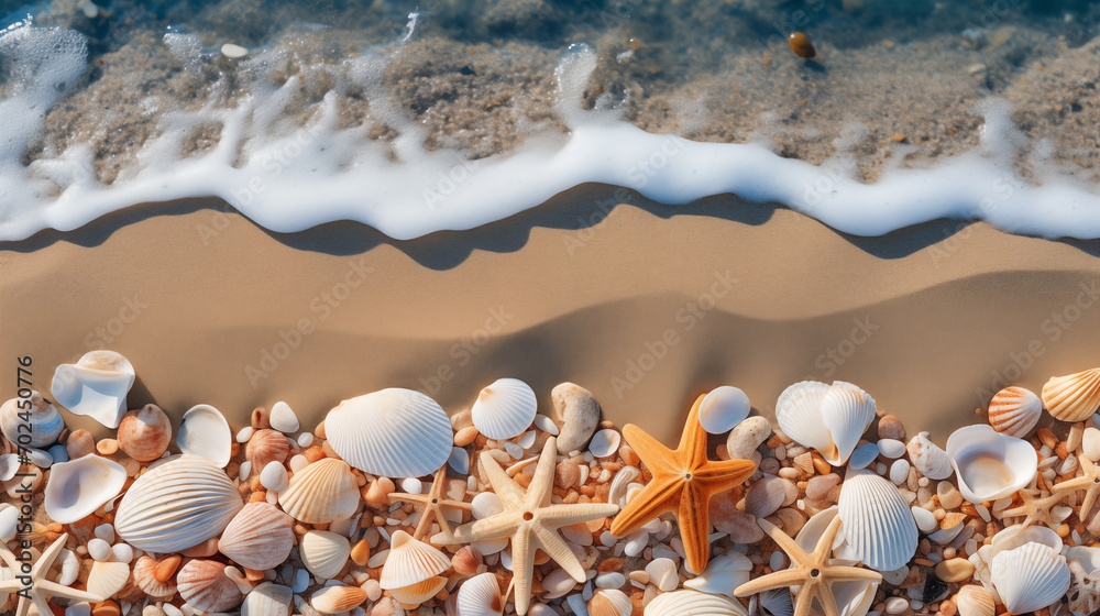 Naklejka na ściany i meble - Seabed with different seashells and sea stars, top view.