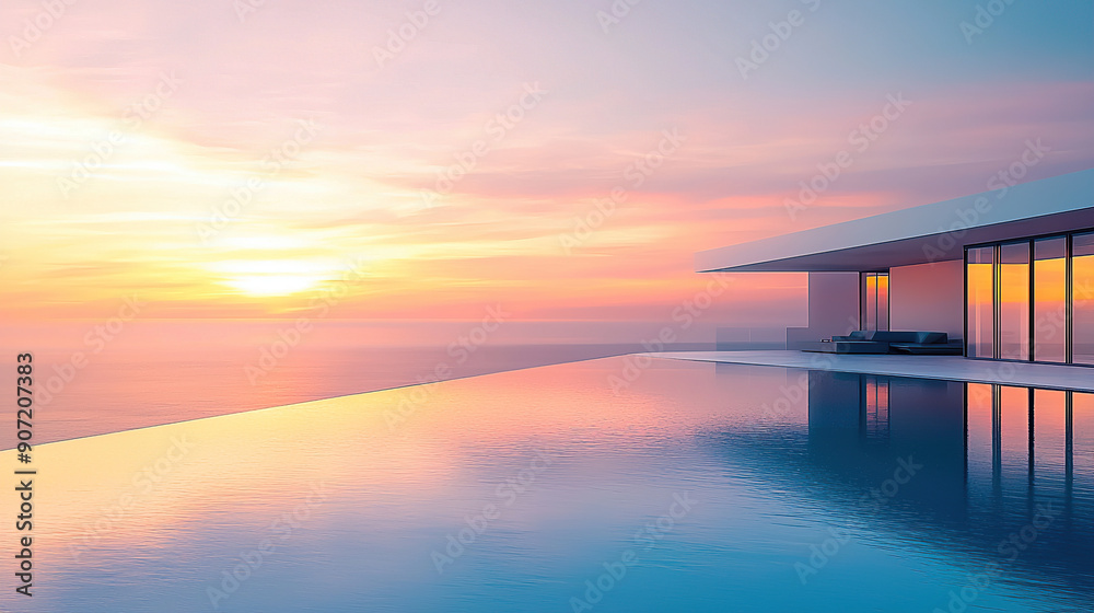 Naklejka na ściany i meble - modern architecture, house with infinity pool and sea view at sunset.