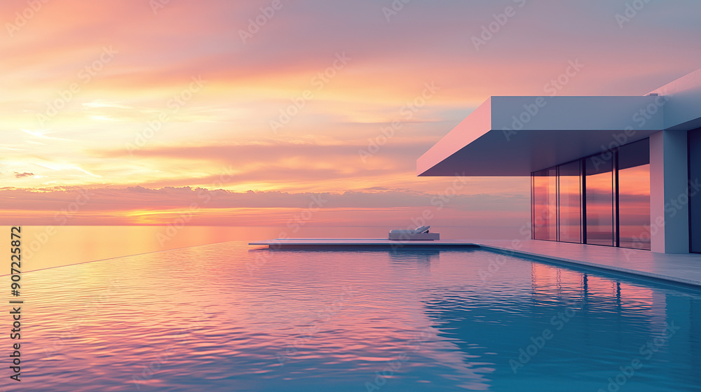Naklejka na ściany i meble - modern architecture, house with infinity pool and sea view at sunset.