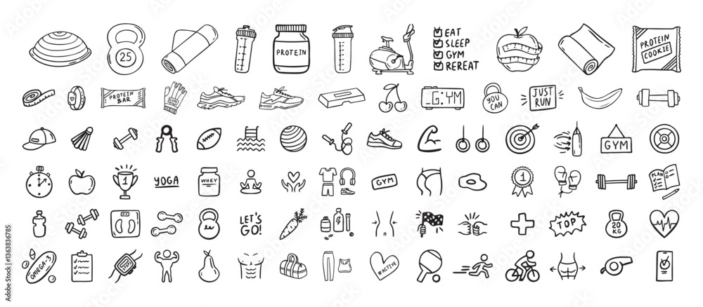 Naklejka na ściany i meble - Fitness, sport and health icons doodle hand drawn set. Healthy lifestyle isolated symbols.