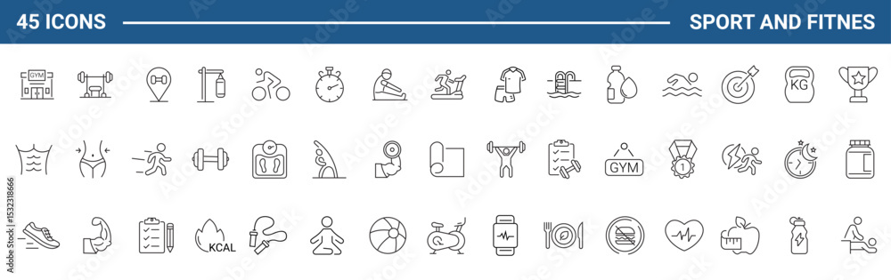 Naklejka na ściany i meble - Sport and Fitness set of web icons in line style. Gym and health care. Healthy lifestyle icons. Nutrition and dieting, training, body care, healthy food, workout, muscle, and weight. Editable Stroke.
