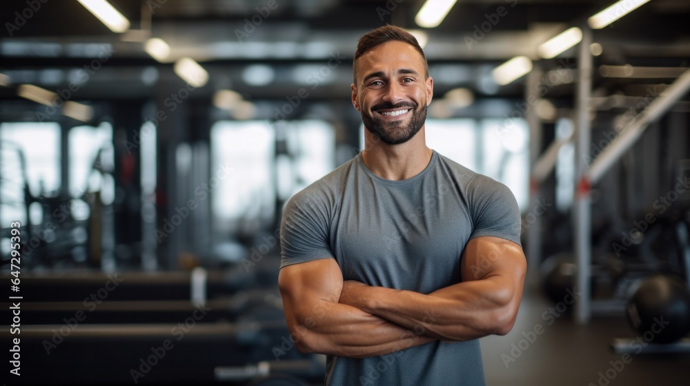 Naklejka na ściany i meble - A man wearing a workout attire against a bright gym interior background..