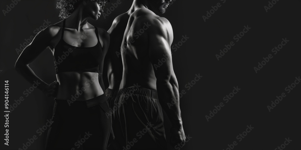 Naklejka na ściany i meble - Muscular man and athletic woman posing on a black background. Advertising banner layout for a gym or fitness trainer..