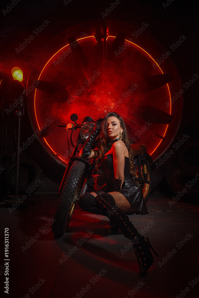 >Naklejki na ściany i meble>Stylish beautiful young woman in black leather corset and boots posing on vintage motorcycle on old garage dark interior background.