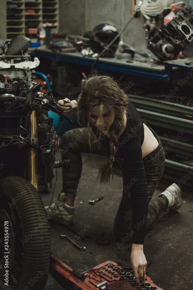 Naklejka na ściany i meble - beautiful girl with long hair in the garage repairing a motorcycle.