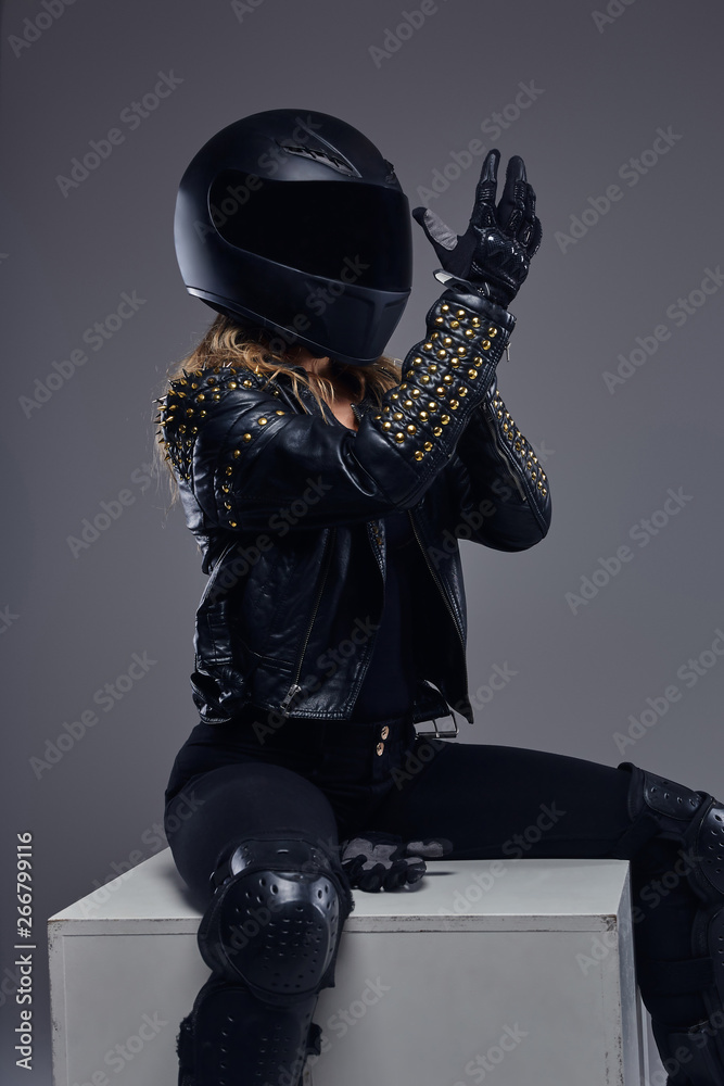 >Naklejki na ściany i meble>Portrait of a biker girl wearing leather racer costume and protective helmet putting on gloves in a studio on a gray background.