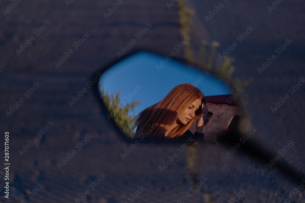 Naklejka na ściany i meble - Beautiful young girl with a fashionable hairstyle and red lips poses next to motorcycle.