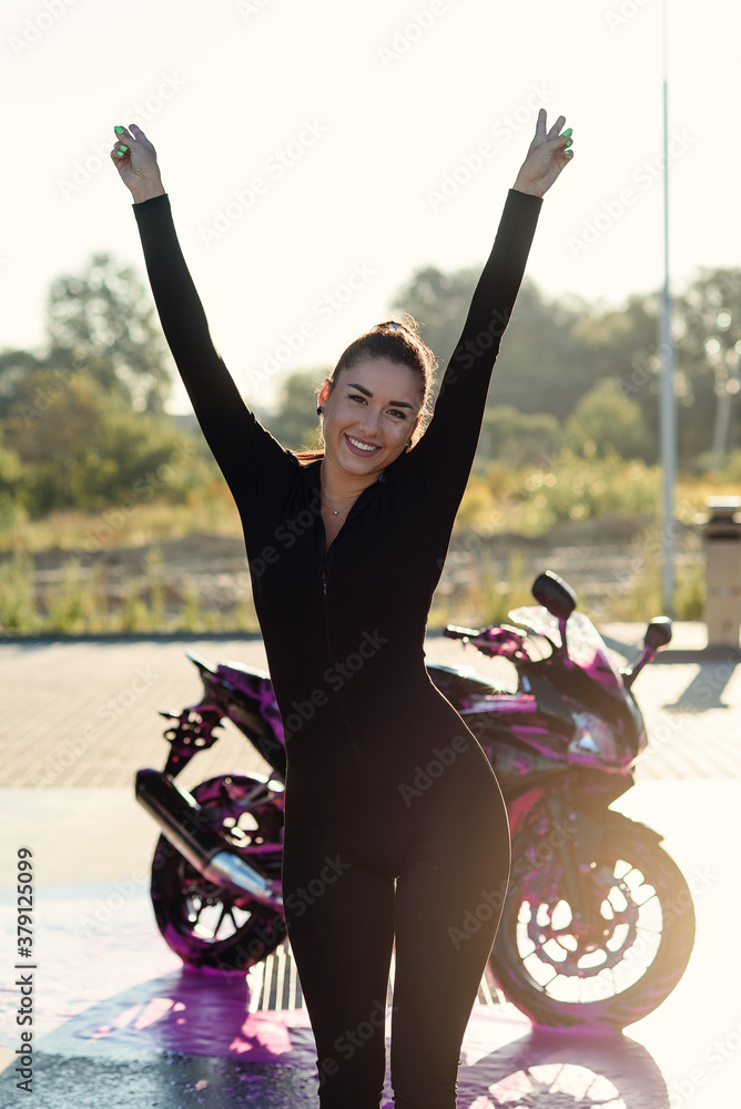 Naklejka na ściany i meble - Beautiful joyful young woman in tight fitting black suit raised hands up near sport motorcycle at self service car wash..