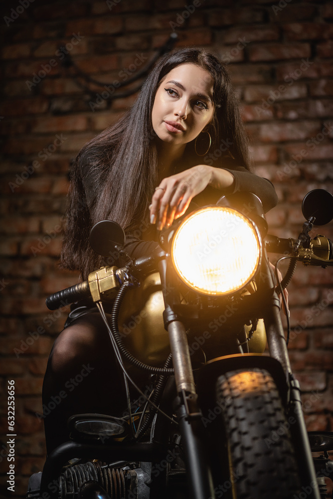 Naklejka na ściany i meble - Young beautiful girl with dark hair on the old motorbike..