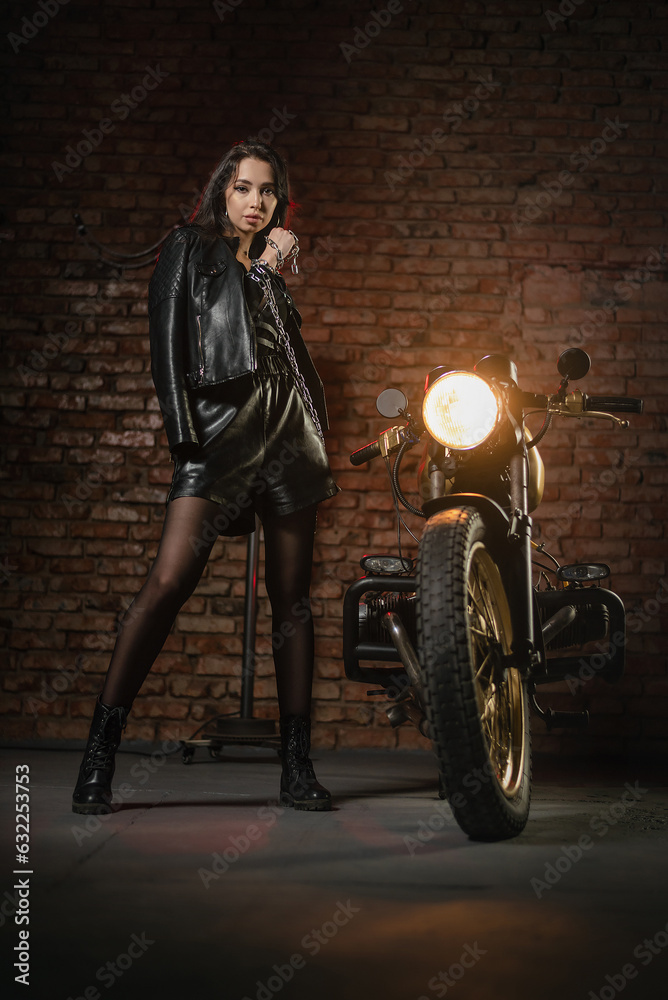 Naklejka na ściany i meble - Young beautiful girl with dark hair on the old motorbike..