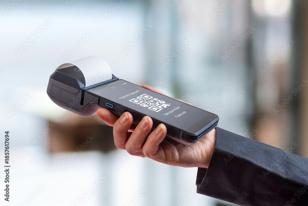 >Naklejki na ściany i meble>Wybrane dla Ciebie>POS terminal displaying QR code payment interface, representing digital wallet transactions, mobile payments, and modern fintech solutions in retail environment