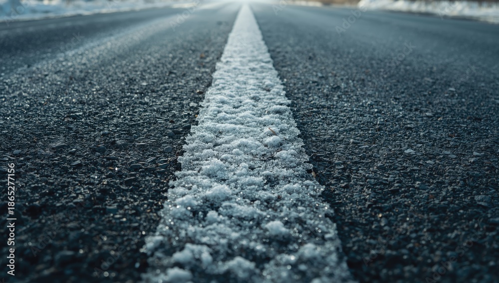 Naklejka na ściany i meble - Snow-covered road surface with ice layers, winter landscape providing a textured background for travel-related layouts.