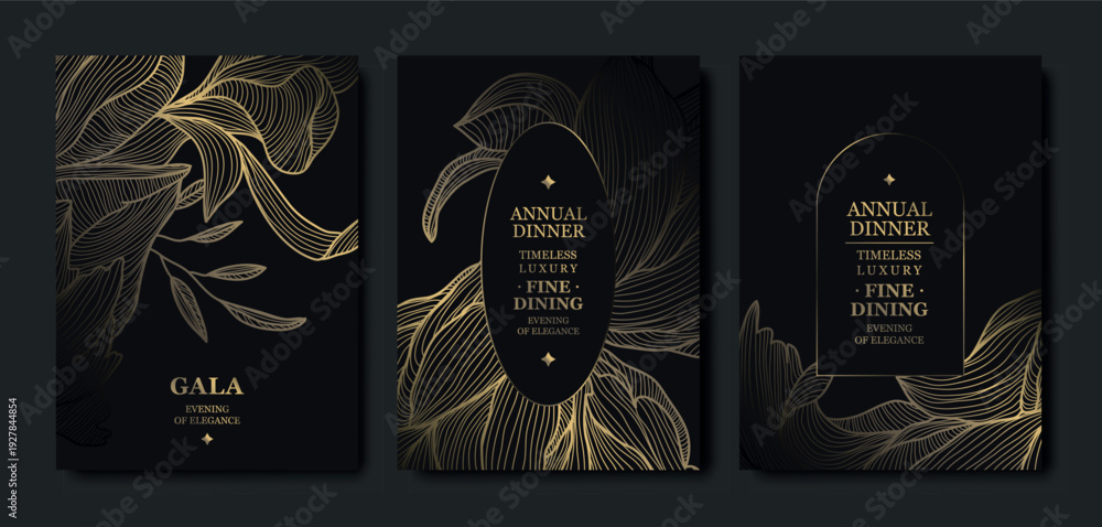 >Naklejki na ściany i meble>Wybrane dla Ciebie>Luxury dark background, elegant gold floral line pattern, leaves, flowers. Vector design wedding invitations, gala dinners, wine labels, birthday cards, tropical event flyers