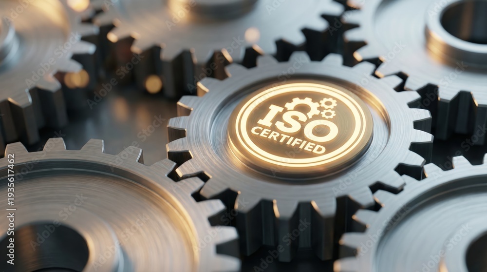 Naklejka na ściany i meble - ISO certified quality management concept with glowing text on industrial metal gears..