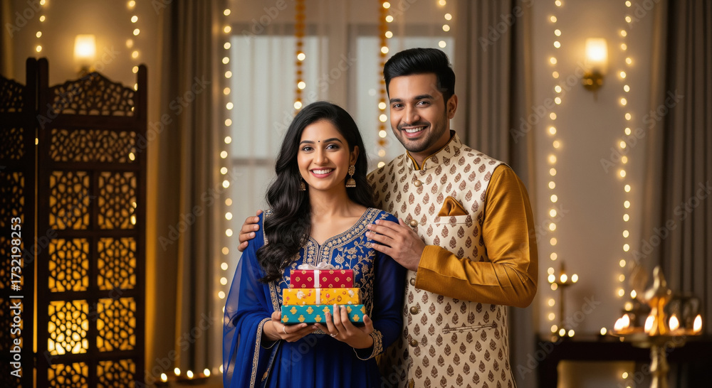 Naklejka na ściany i meble - Indian couple in blue and gold festive attire stands together in a warmly lit, decorated room, holding colorful gift boxes and surrounded festive lights..