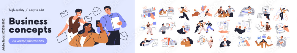 Naklejka na ściany i meble - Business concepts, office work, professional icons set. Job success, communication, management, planning, developing strategy, corporate team. Flat vector illustration isolated on white background.