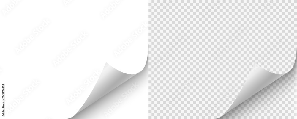 Naklejka na ściany i meble - Blank page with curled edge corner and shadow, rolled up stickers, peel banners, bent sheet, page curl with shadow on blank sheet, curled page corner isolated on transparent and white background.