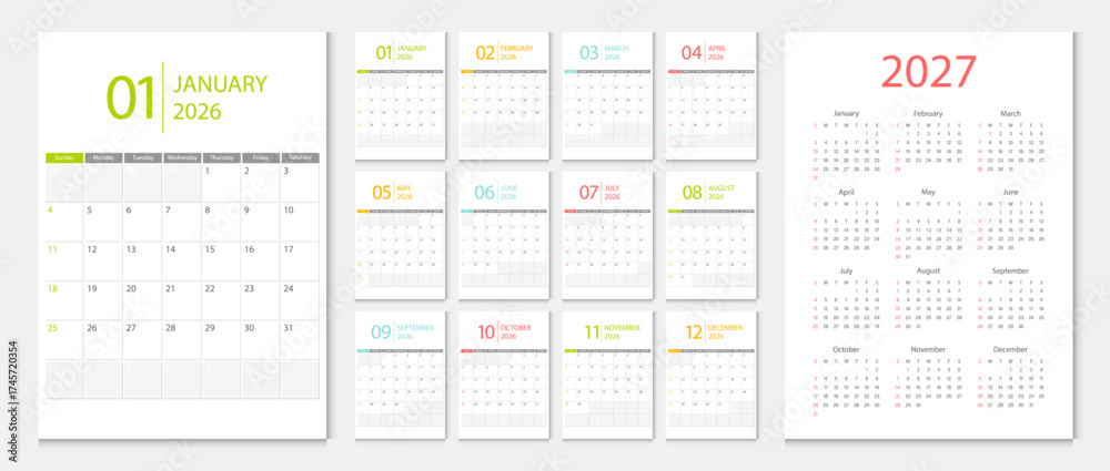 Naklejka na ściany i meble - Calendar 2026, calendar 2027 week start Sunday corporate design template vector..