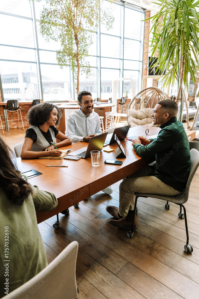 Naklejka na ściany i meble - A group of three workers are smiling and talking while sitting at a table.