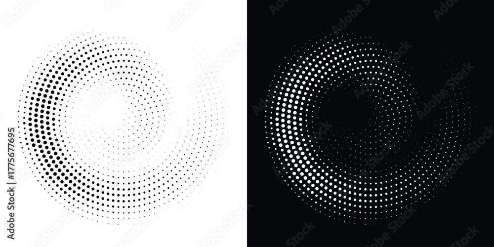 Naklejka na ściany i meble - Halftone Circular Dot Pattern. Circle Frame using Halftone Dots Raster Texture. Polka Dots. Spiral logo Icon. Radial design element. Vector Illustration..