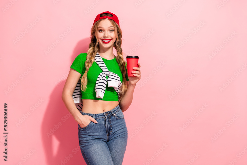 Naklejka na ściany i meble - Young woman in green crop top red cap and braids holding coffee cup smiling on pink background.