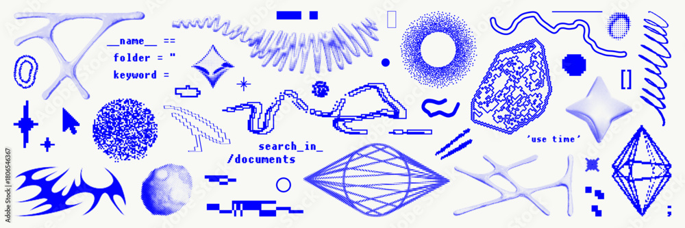 Naklejka na ściany i meble - Graphic shape asset pack. Pixelated, bitmap, halftone and dithered abstract geometric elements, also basic forms. Vector isolated shape for sticker, web, cyber design.