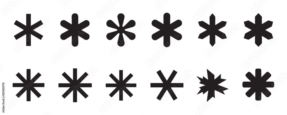Naklejka na ściany i meble - Collection of twelve black asterisk symbols in various geometric and rounded styles arranged in two rows, showcasing a minimalist icon set for typography and design.