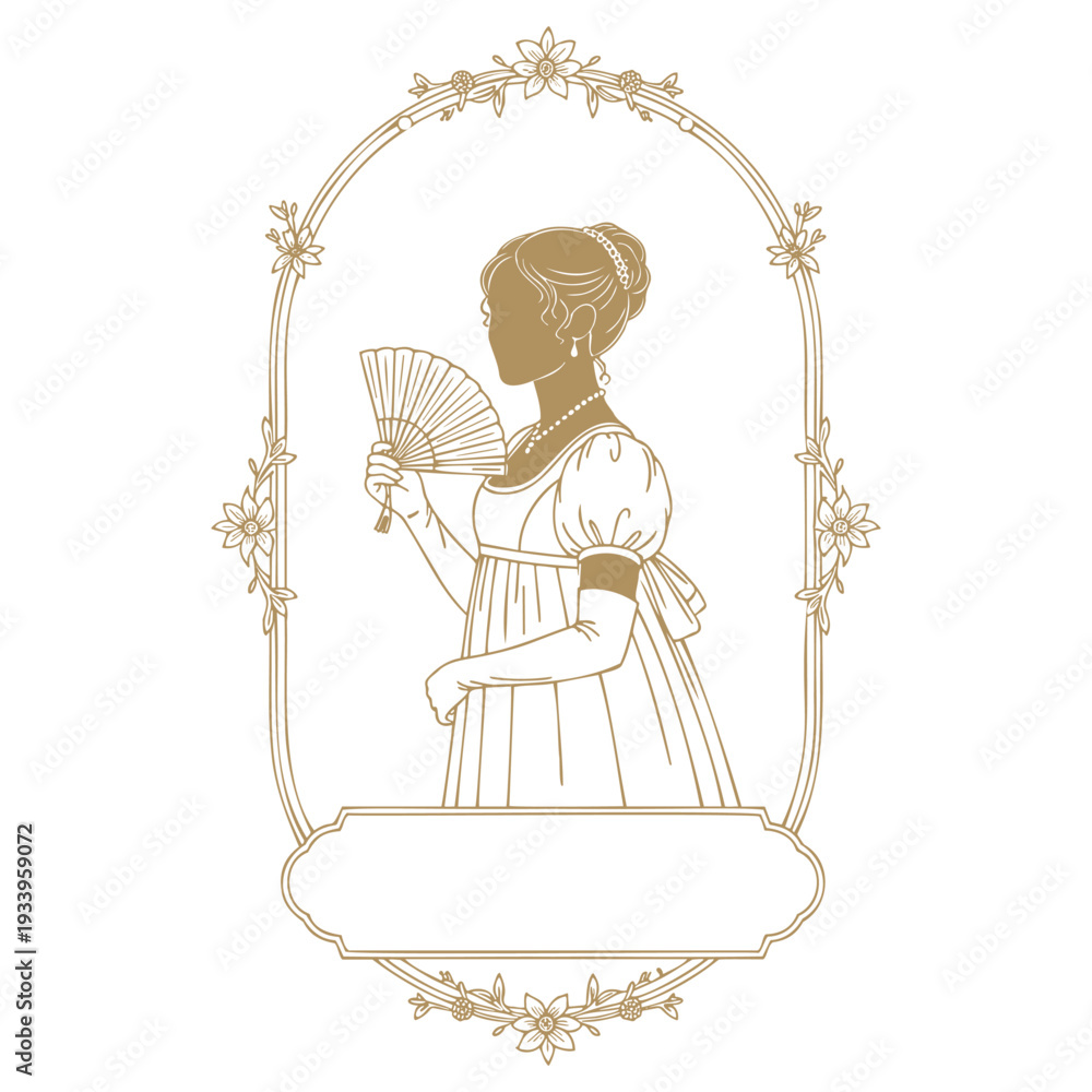 Naklejka na ściany i meble - Elegant regency era woman silhouette with a fan in floral arch frame, vintage victorian style design with decorative label.